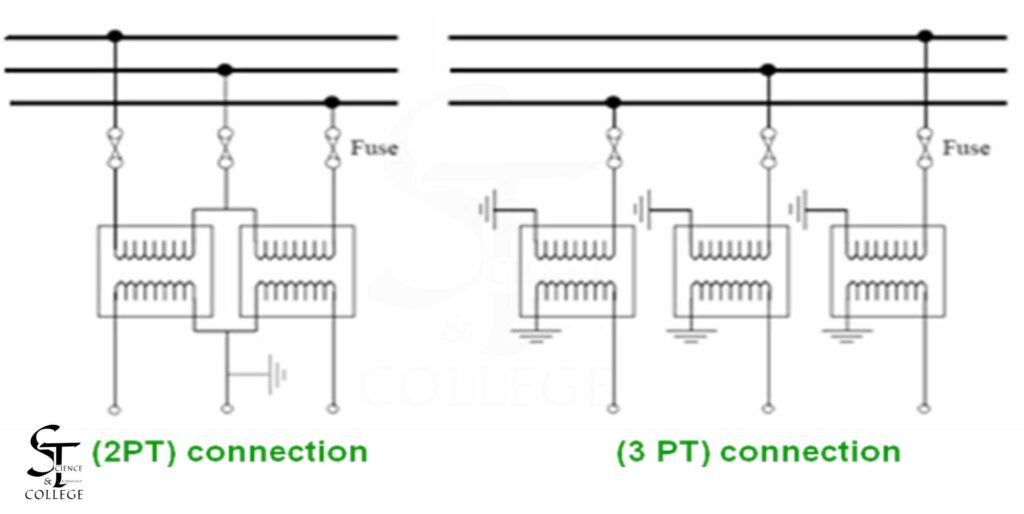 - يتم تركيب مع دائرة القوي من خلال فيوز ضغط متوسط لقياس الجهد ناحية الملفات الأبتدائية وتحويلها إلى قيمة بسيطة ناحية الملفات الثانوية. حيث يمكن قياسها عن طريق عدادات القياس أو استخدامها لتغذية أجهزة الإحساس بالجهد لمراقبة الجهد عند انخفاضه أو ارتفاعه O.V relay- U.V.