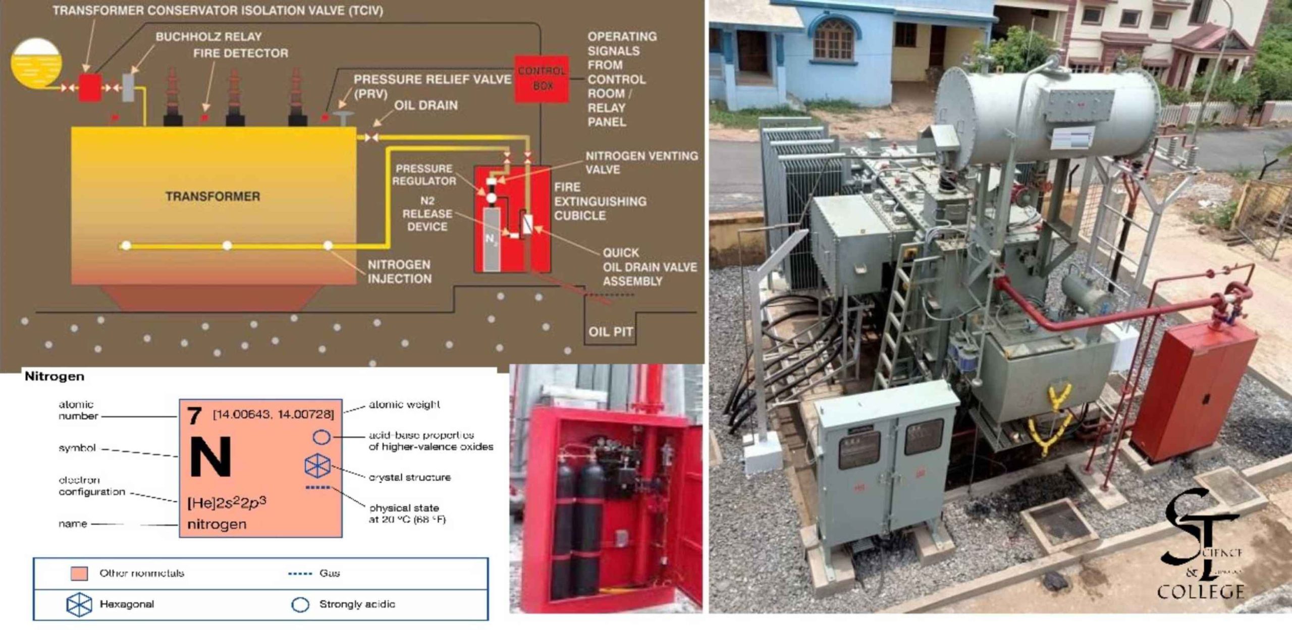 الوقاية من الحريق: النيتروجين يساعد أيضًا في تقليل احتمالية نشوب الحريق داخل المحول: كونه غازًا خاملًا، يمنع حدوث الاشتعال لأنه يحل محل الأكسجين اللازم لحدوث الاحتراق. هذه الخاصية مهمة بشكل خاص في حالات الأعطال الكبيرة التي قد تؤدي إلى تكوين شرارات أو ارتفاع حرارة الزيت