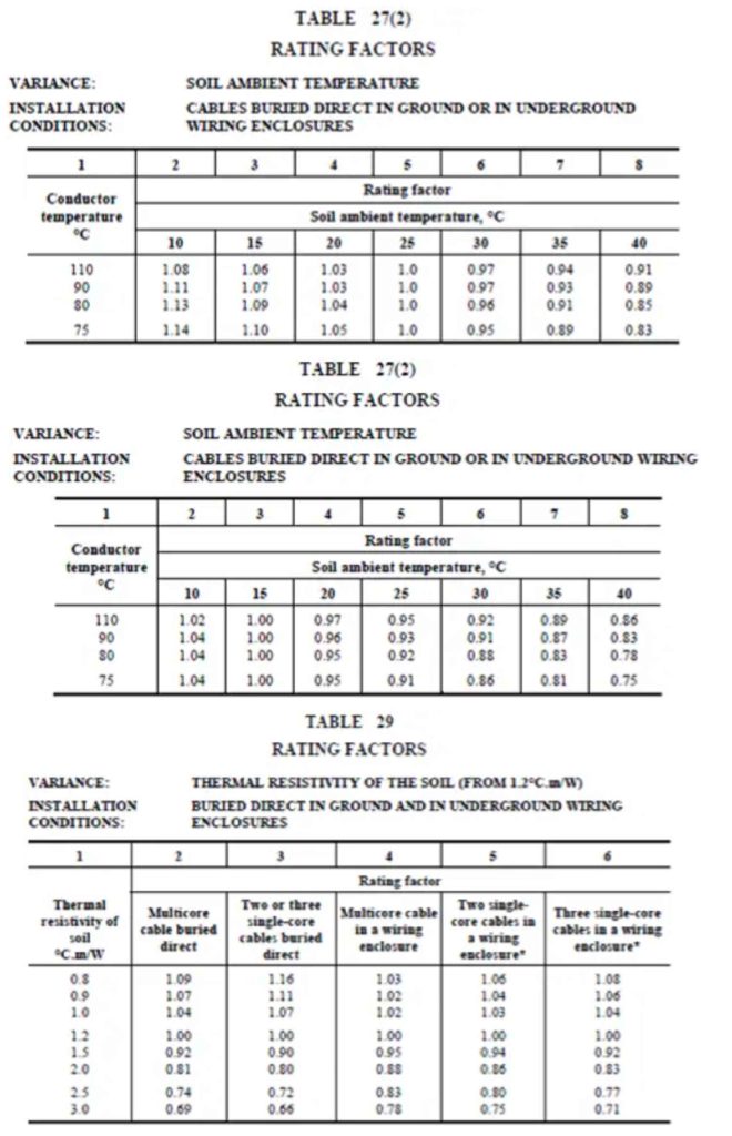 - Table 27(1): Derating factors for ambient air and concrete-slab temperatures (Australia).