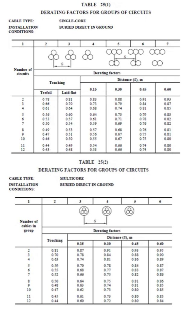 - Table 25(1) & 25(2): Grouping factors for directly buried single-core and multicore cables.