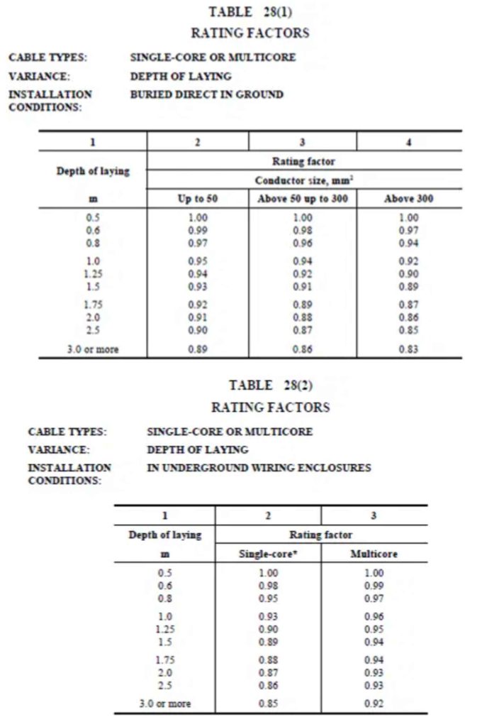 - Table 28(1): Depth of burial factors for directly buried cables.
