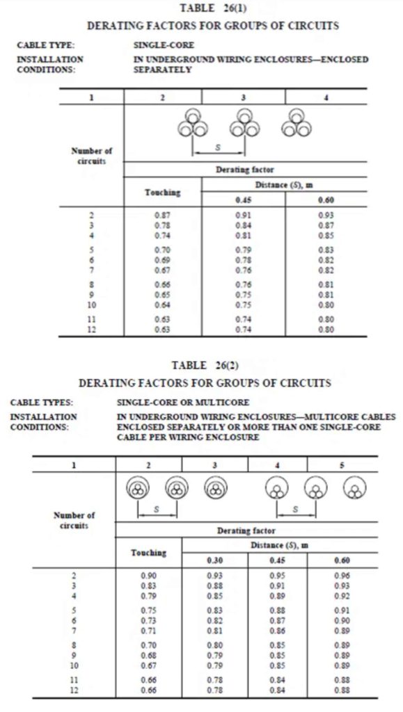 - Table 26(1) & 26(2): Grouping factors for buried cables within enclosures.