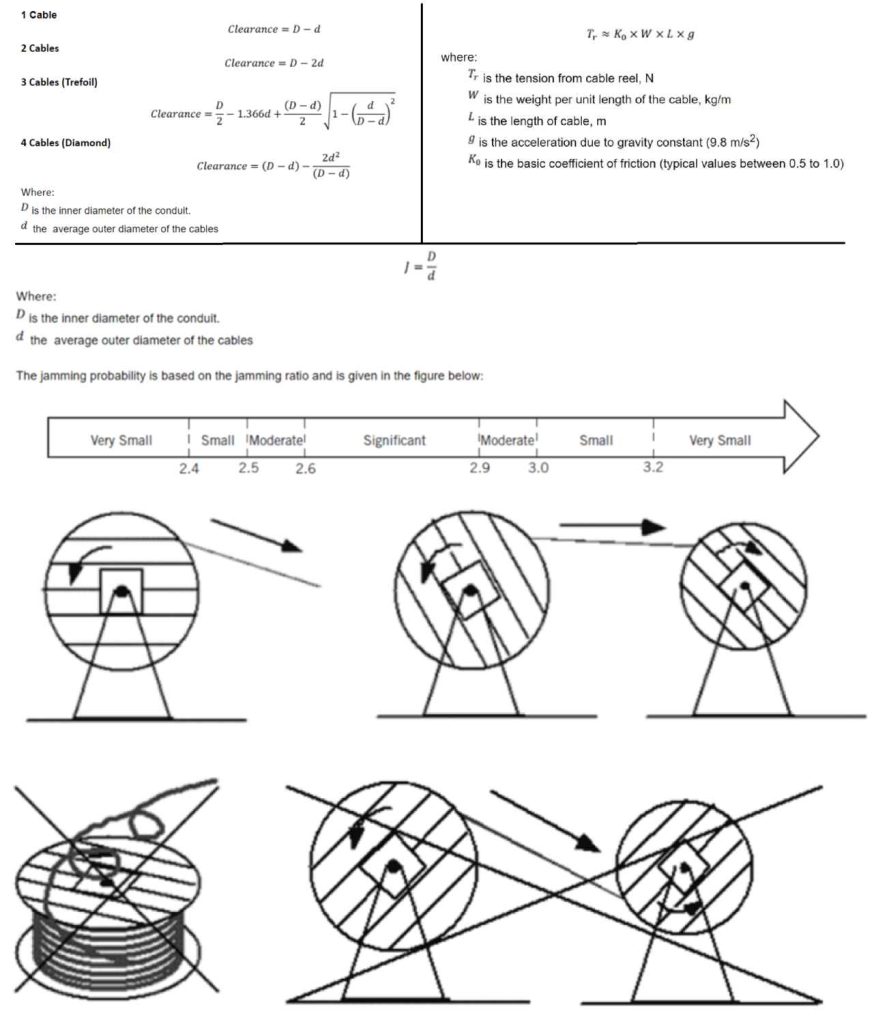 - Jamming Ratio: This predicts the tendency for cables to wedge (jam) in a bend, typically occurring when the conduit inner diameter (ID) is between 1.05 and 1.1 times the cable bundle diameter (for three cables in a triangular formation). The ratio is calculated as Conduit ID / Cable Diameter.