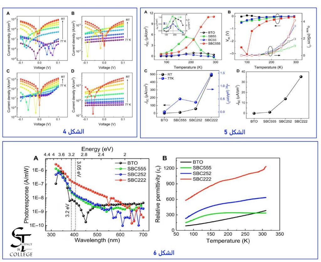 الشكل 4: خصائص التيار-الجهد الكهروضوئية المعتمدة على درجة الحرارة. خصائص التيار-الجهد المقاسة بـ 3.06 إلكترون فولت لـ (أ) BTO، (ب) SB55، (ج) BC55 و(د) SBC555. (المصدر: Science Advances)