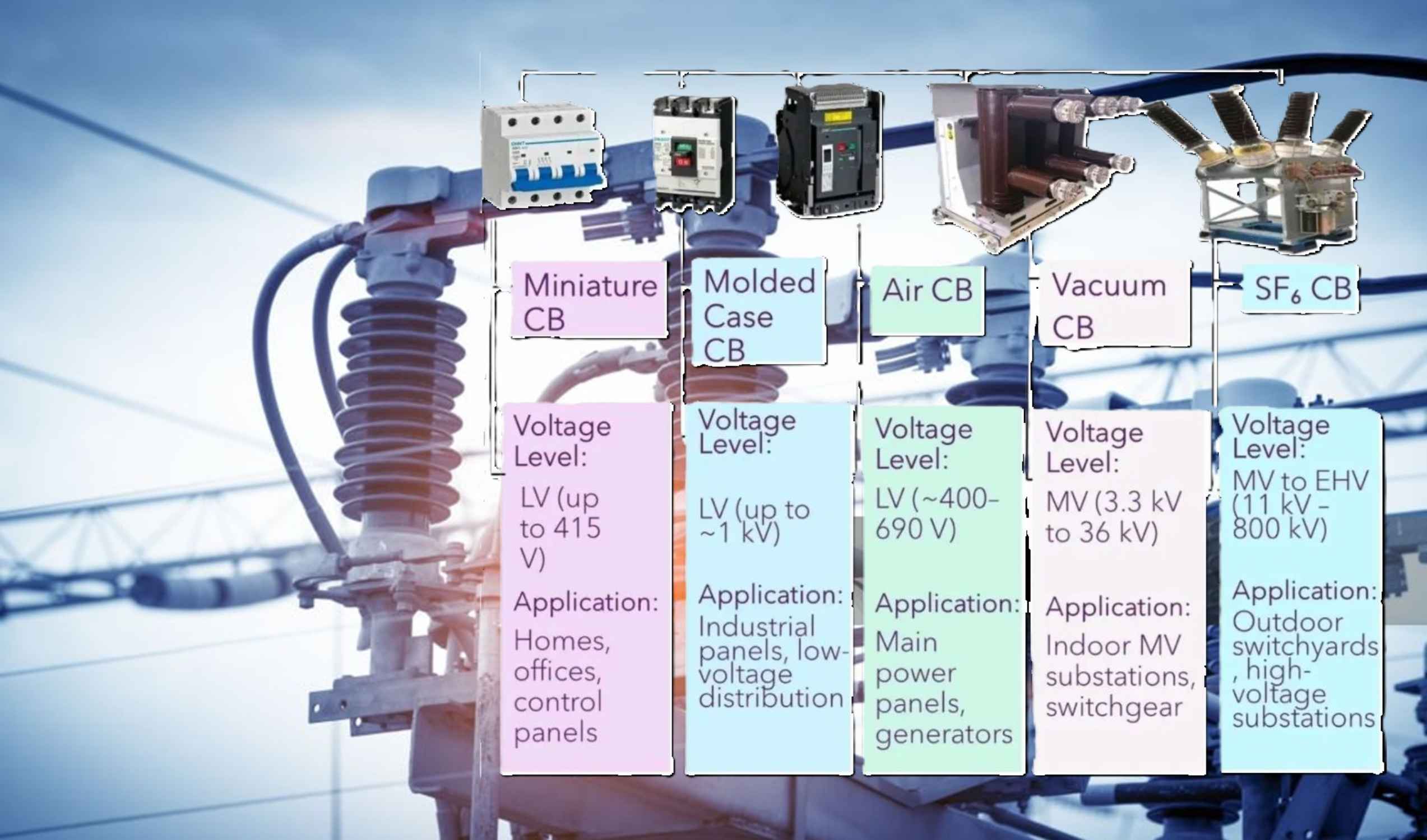 | SF6 | Sulfur Hexafluoride Gas | MV, HV, EHV (up to 1200 kV | Dominant, Industry Standard |