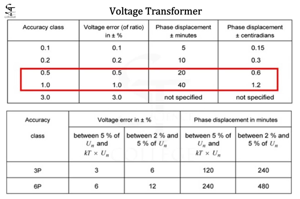 بالنسبة لـ VT المستخدمة للحماية، فإن فئات دقة IEC القياسية هي 3P أو 6P (أسفل الجدول المعطى الذي يوضح أخطاء الطور والجهد فيما يتعلق بفئة الدقة لـ VT الواقية).