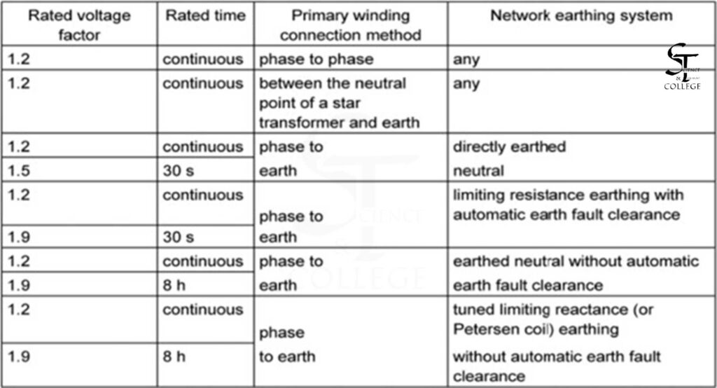 من أجل تحديد الحد الأقصى للجهد للمحول للوصول إلى المستوى المطلوب من الحرارة والدقة، نقوم بضرب عامل الجهد المقنن بالجهد الأساسي المقنن أي [Max voltage= Kt*Vp ]. علاوة على ذلك، يتم تحديد عامل الجهد المقنن من خلال الحد الأقصى لجهد التشغيل، والذي يعتمد على نظام تأريض الشبكة والطريقة التي يتم بها توصيل الملف الأساسي لـ VT.