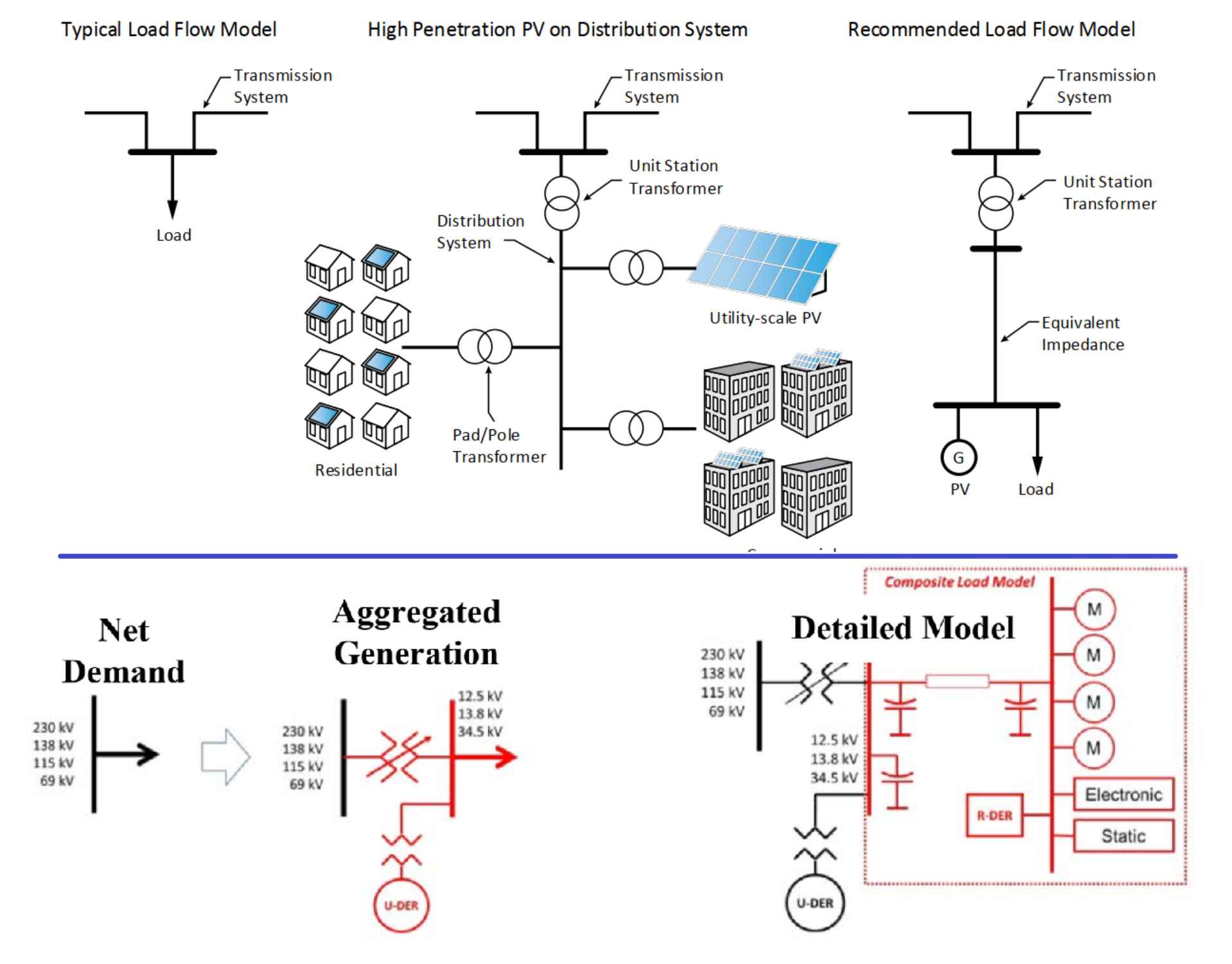 Increasing DER penetration alters the interactions between bulk and distribution systems, making integrated modeling essential. Load flow (power flow) analysis is a foundational study for assessing impacts on bus voltages and line power flows following contingencies (e.g., the loss of a central PV plant). Modeling approaches differ based on system scope: