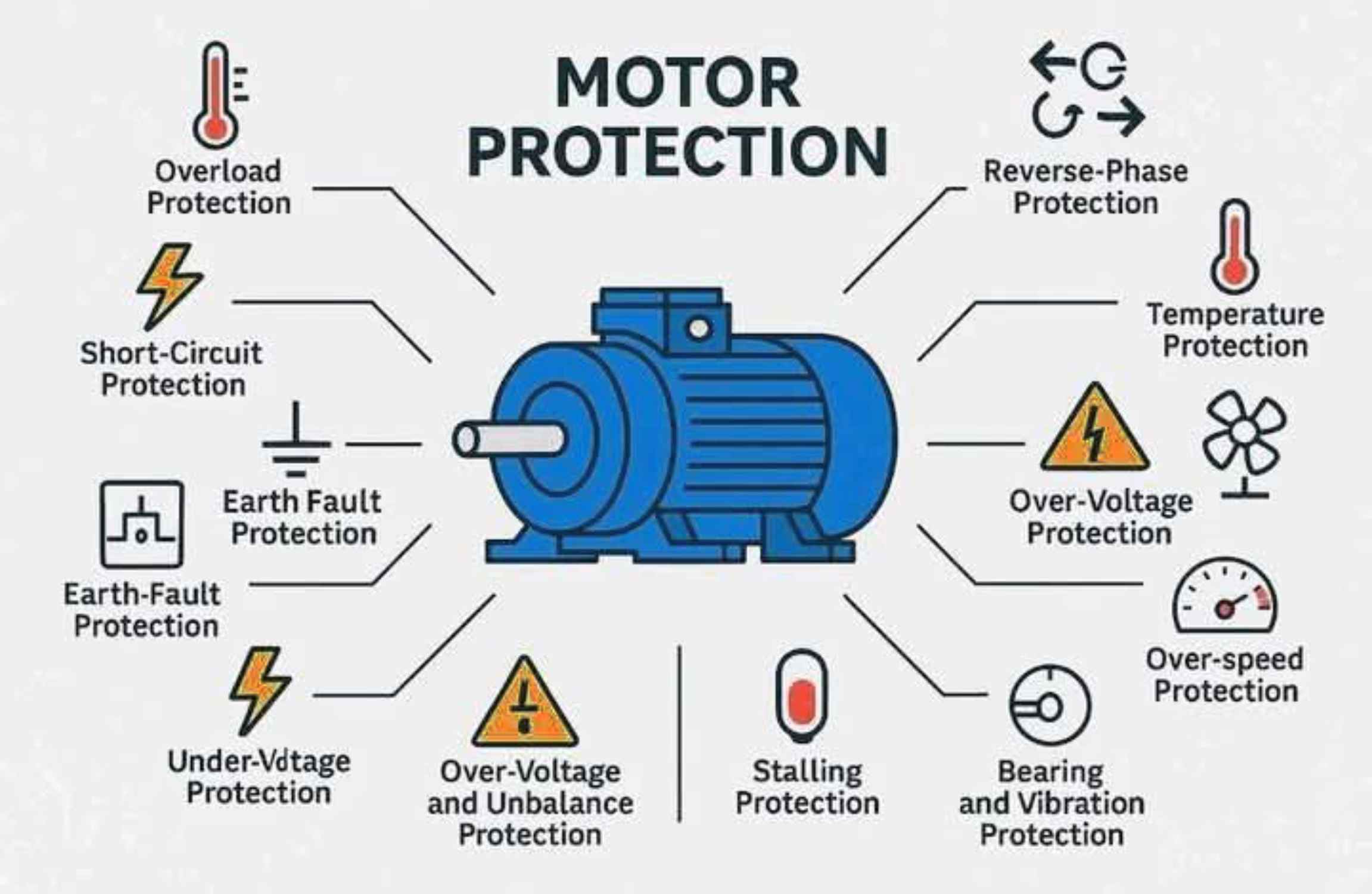 A comprehensive motor protection strategy addresses five main fault categories, each requiring a distinct protective mechanism.