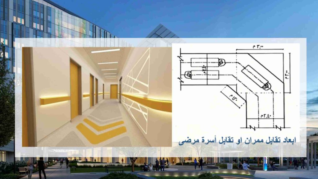 يجب تصميم ممرات منفصلة لحركة المرضى (من المدخل إلى غرف الكشف) والأطباء (من مكاتبهم إلى الغرف) لضمان الخصوصية والكفاءة. في الشكل 16 (أسس تصميم المستشفيات)، يُظهر التخطيط توزيعًا واضحًا للمداخل (“مدخل الحياة”، “مدخل الإدارة”)، مما يشير إلى محاولة فصل التدفقات. دراسة تدفق المرضى اليومي وتنسيق المسارات مع الأقسام الأخرى (مثل الطوارئ) لتجنب التداخل. – الموقع المثالي للعيادات الخارجية يُوازن بين سهولة الوصول للمرضى والتكامل مع الخدمات الأخرى (مثل التشخيص والصيدلية). التخطيط في الشكل 16 يتبع مبدأ المركزية، حيث تظهر العيادات كوحدة مستقلة لكنها متصلة بخدمات حيوية. يُنصح بمراعاة توسعة المستقبل عند التصميم، خاصة إذا كان المستشفى سيضيف تخصصات جديدة. ملاحظة: لتحقيق التصميم الأمثل، يُفضل دراسة تدفق المرضى اليومي وتنسيق المسارات مع الأقسام الأخرى (مثل الطوارئ) لتجنب التداخل
