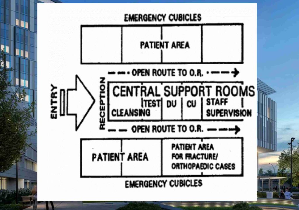 الشكل 21 تصميم فراغات الطوارئ في المستشفيات مع وتوضيح العلاقة بين فراغات القسم