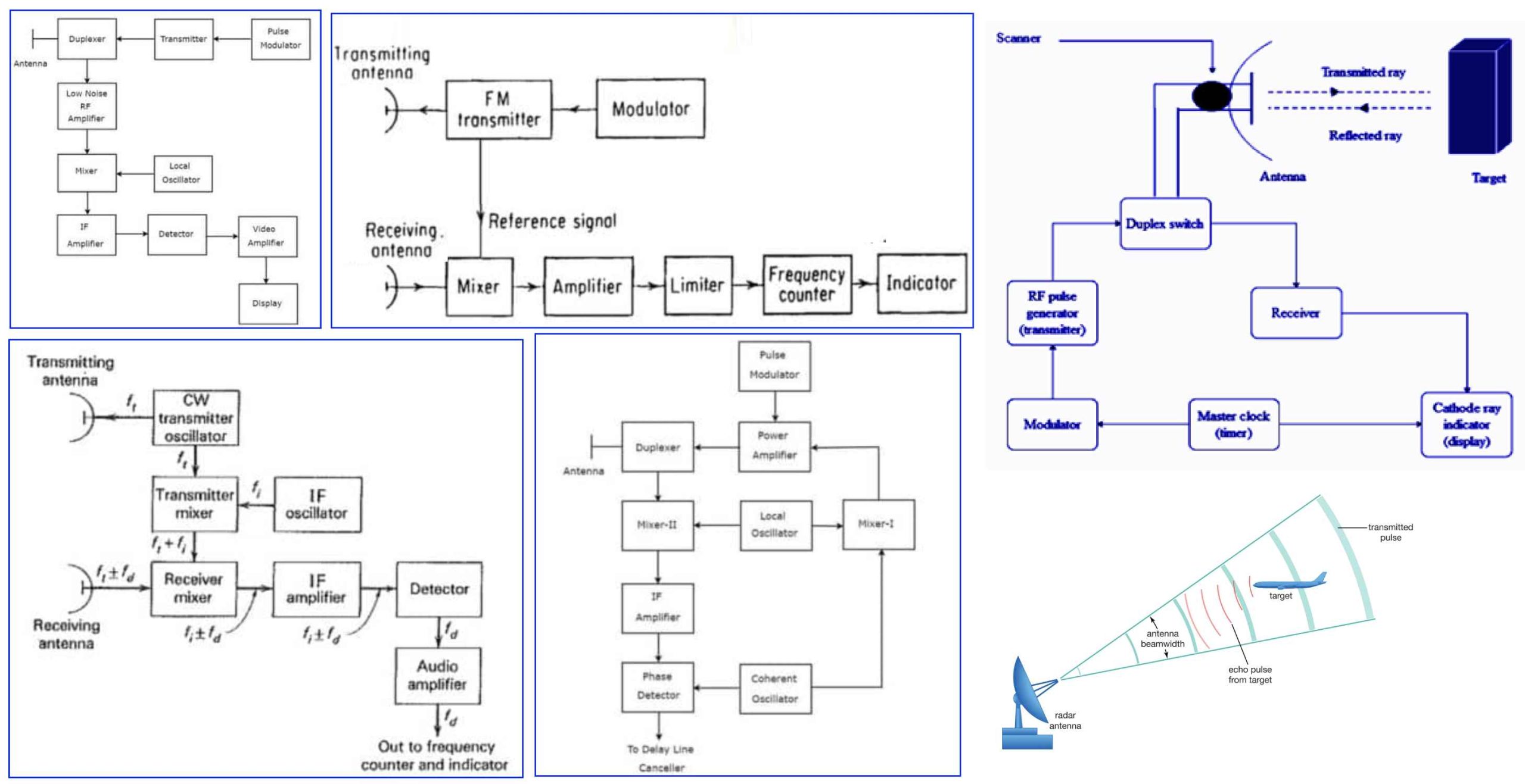 - Basic CW Radar comprises a CW Transmitter, a Receiver Mixer (which heterodyneses the received signal with a portion of the transmitted signal or an LO signal), and a Doppler Amplifier. The output is a signal at the Doppler frequency (f_d), which is proportional to the target’s radial velocity.