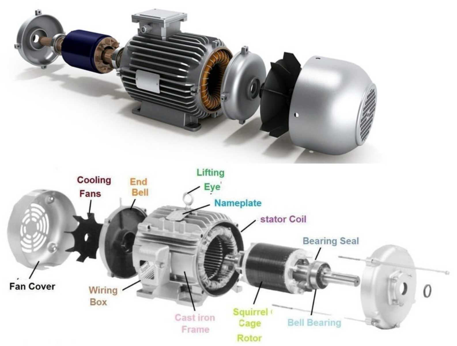 - ملاحظة حاسمة: لا يوجد أي توصيل كهربائي خارجي للدوار. التيارات فيه مستحثة تمامًا من المجال المغناطيسي للجزء الثابت.