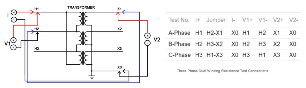 Note: To reduce core saturation time, jumpers should connect windings of opposite polarities. If the resistance difference between windings exceeds a factor of 10, test them separately for better accuracy.
