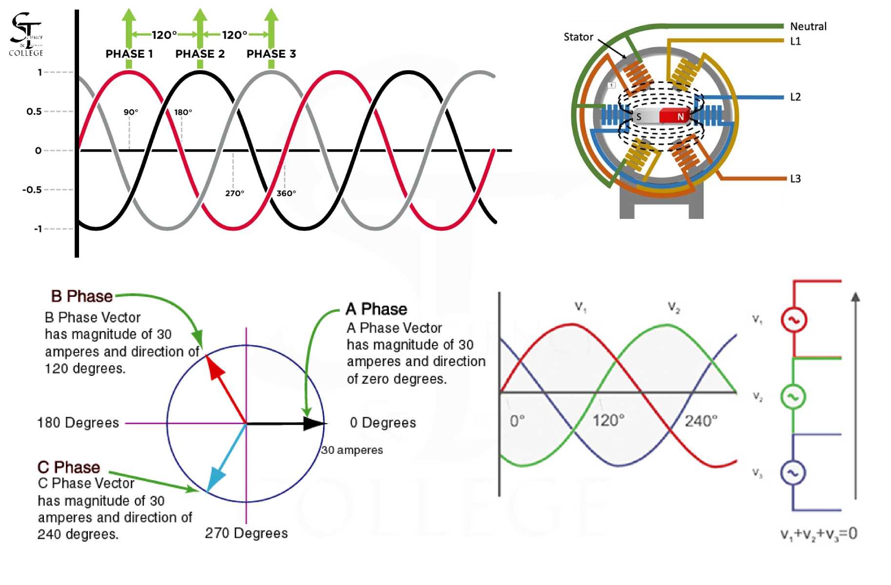 قبل الغوص في الأسباب، من المهم فهم المبدأ الأساسي. التيار المتردد (AC) يتذبذب ذهابًا وإيابًا. في نظام أحادي الطور، لديك موصل واحد “حار” (Phase) وموصل محايد (Neutral). في نظام ثلاثي الطور، لدينا ثلاثة موصلات كل منها يحمل تيارًا مترددًا، ولكن بزاوية طور متغيرة بمقدار 120 درجة عن بعضها البعض. هذا الانزياح الزاوي هو مفتاح كل المزايا.